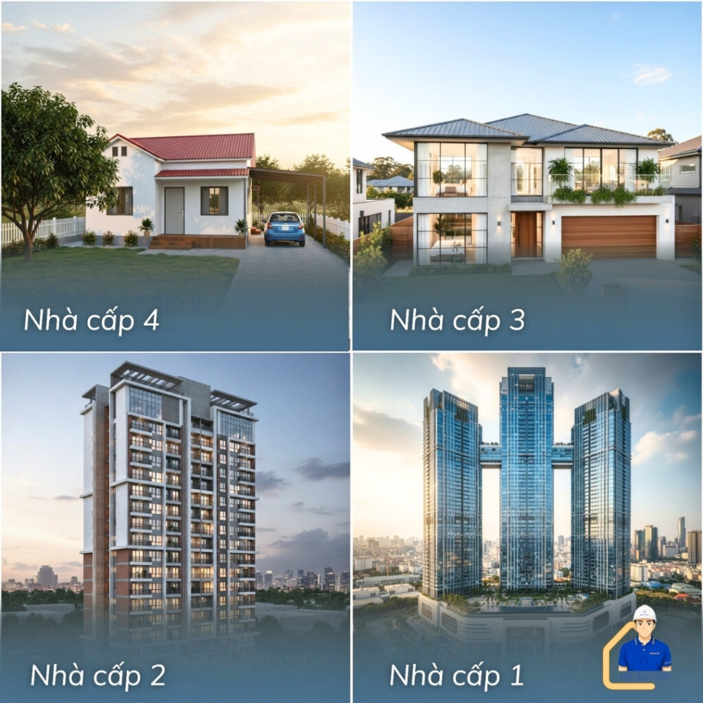 Vật liệu bao che & Hoàn thiện | Vật liệu cao cấp, xây gạch, mái BTCT hoặc mái ngói. Tiện nghi đầy đủ, chất lượng rất cao. | Vật liệu tương đối tốt, xây gạch, mái bằng BTCT hoặc mái ngói. Tiện nghi đầy đủ. | Vật liệu xây dựng phổ thông, tường gạch, mái ngói hoặc Fibroociment. Tiện nghi cơ bản. | Vật liệu chất lượng thấp hơn, tường gạch 1 lớp (110mm), mái ngói hoặc tấm lợp. Tiện nghi sinh hoạt thấp. |