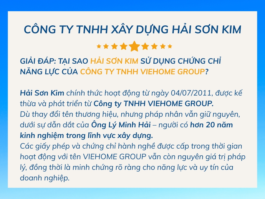 Công ty TNHH Xây Dựng Hải Sơn Kim hiện nay chính là sự kế thừa và phát triển từ Công ty TNHH VIEHOME GROUP.