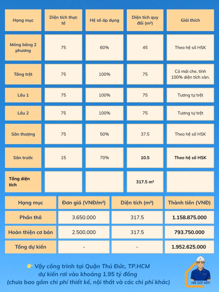 Lưu ý: Đây là cách tính giá xây nhà trọn gói (chưa bao gồm chi phí thiết kế, nội thất và các công trình phụ khác). Đồng thời, chi phí thực tế có thể điều chỉnh tùy vào lựa chọn vật liệu và yêu cầu riêng của Chủ đầu tư.