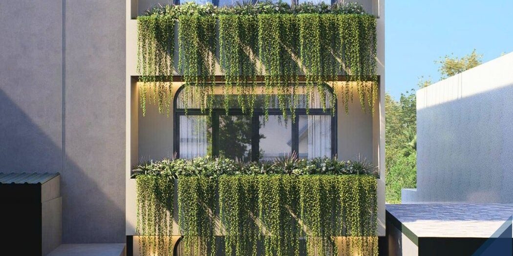 Điểm đặc trưng của công trình không nằm ở chi tiết trang trí, mà ở cách xử lý không gian và lớp vỏ công trình. Hệ ban công được thiết kế theo phương đứng, kết hợp cây xanh rủ xuống tạo thành một lớp “mặt đứng sống”. Đây vừa là yếu tố thẩm mỹ, vừa đóng vai trò như lớp đệm khí hậu, giúp giảm bức xạ nhiệt và điều hòa ánh sáng tự nhiên.