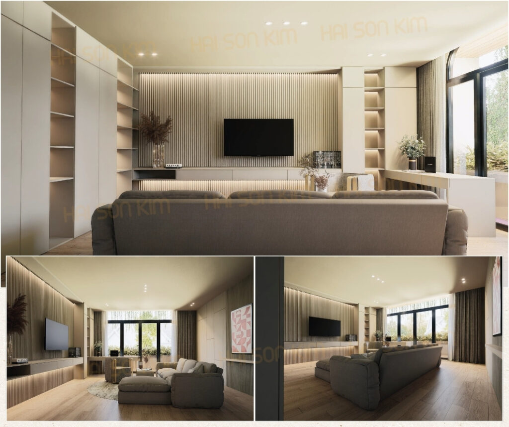 Vật liệu và màu sắc trong công trình được lựa chọn theo nguyên tắc: tối giản – đồng bộ – bền vững theo thời gian. Tổng thể sử dụng bảng màu trung tính làm nền, bao gồm các gam như be, kem, trắng ngà kết hợp với màu gỗ sáng. Những gam màu này giúp không gian luôn sáng, nhẹ và tạo cảm giác rộng hơn so với diện tích thực tế.