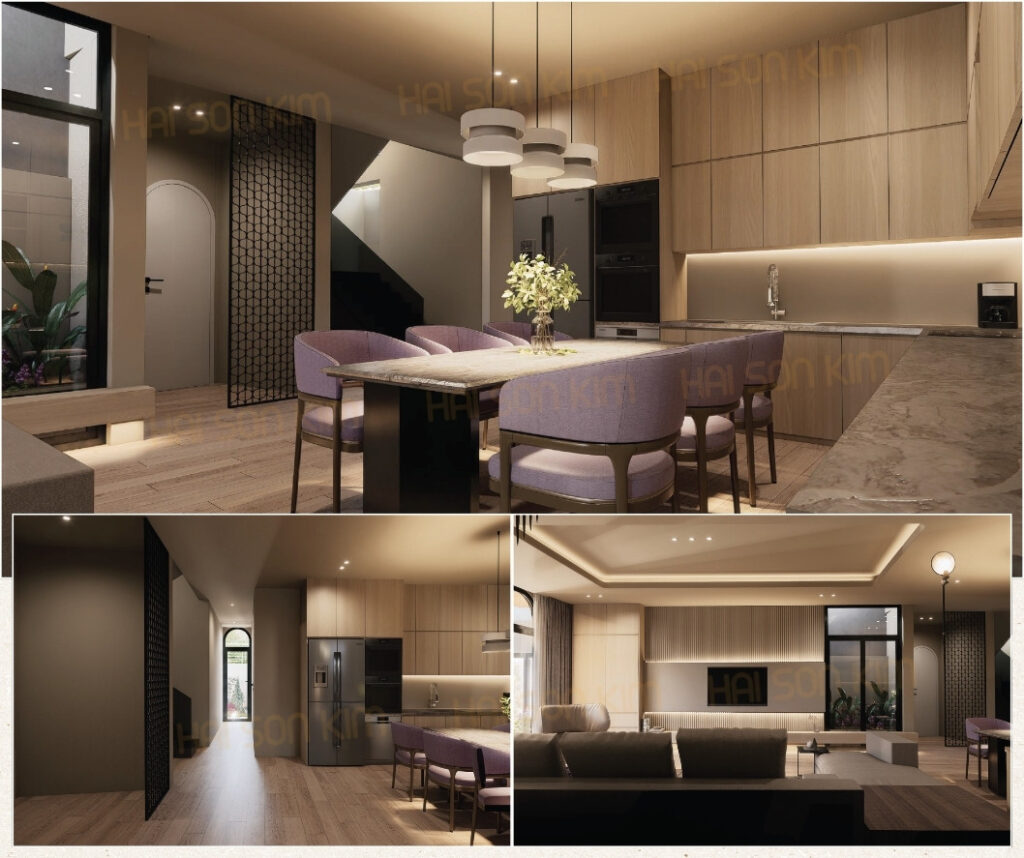 Tuy nhiên, thay vì xem đó là bất lợi, đội ngũ kiến trúc sư Hải Sơn Kim đã khai thác chính những giới hạn này để tạo nên một không gian sống khác biệt – nơi ánh sáng, cây xanh và sự tối giản trở thành yếu tố cốt lõi.