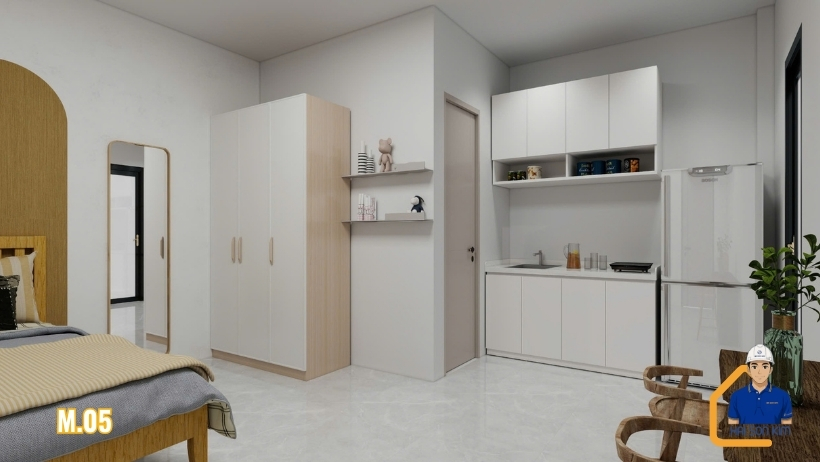 Mặt khác, có thể bố trí thêm gác lửng để gia tăng diện tích sử dụng cho căn hộ dịch vụ mini, đặc biệt phù hợp với mặt bằng trần cao. Gác thường được sử dụng làm khu ngủ hoặc làm việc, giúp tầng trệt thông thoáng hơn cho sinh hoạt chung và bếp. Giải pháp này vừa tối ưu công năng, vừa nâng cao giá trị khai thác và trải nghiệm cho khách thuê.