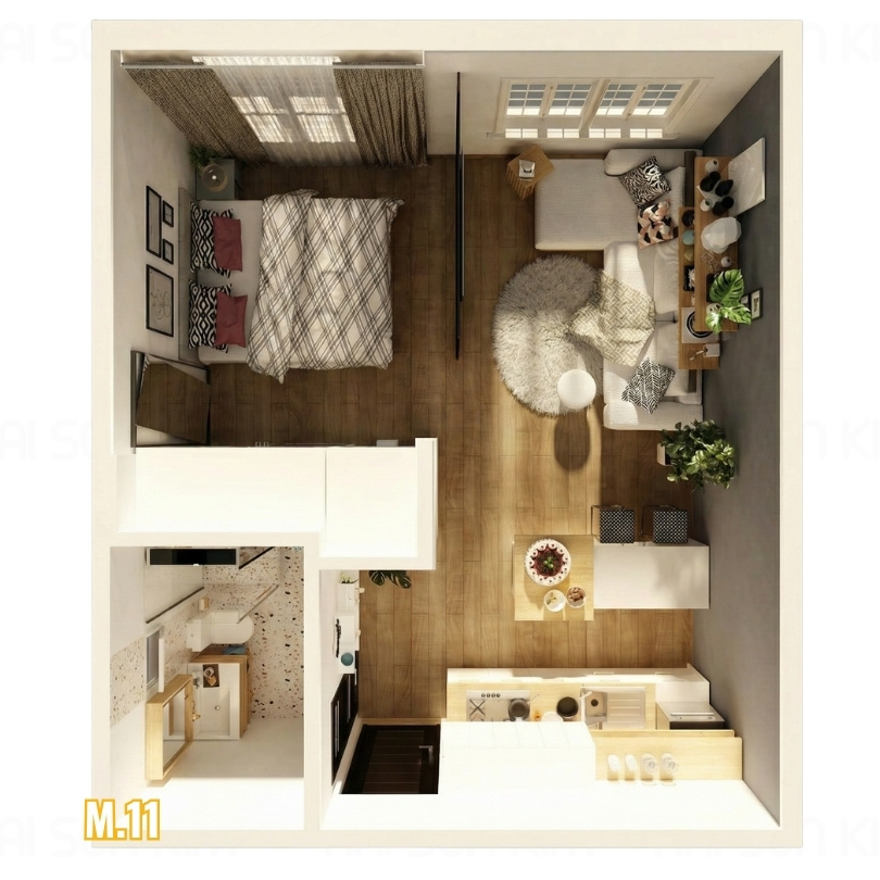 Bố trí không gian sử dụng khoa học là việc sắp xếp đầy đủ các khu vực chức năng như phòng ngủ, bếp – ăn, nhà vệ sinh, khu làm việc và các tiện ích cần thiết trên một diện tích hợp lý. Không gian không cần quá rộng nhưng phải đảm bảo sự cân đối, tránh cảm giác chật chội hoặc lãng phí diện tích.