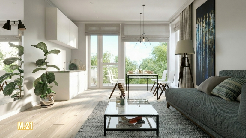 Thiết kế mở giúp không gian căn hộ trở nên thông thoáng và rộng rãi hơn nhờ sự liên kết linh hoạt giữa phòng khách, khu bếp và ban công. Tận dụng ban công và cửa sổ để bố trí cây xanh, sen đá giúp không gian gần gũi hơn với thiên nhiên, đồng thời mang lại cảm giác tươi mát, tràn đầy sức sống và nguồn năng lượng tích cực cho căn hộ.
