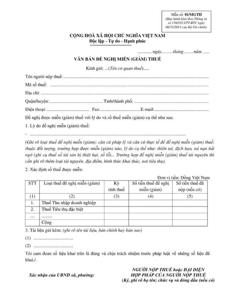 - Cần ghi cụ thể loại thuế đề nghị miễn, giảm như: thuế GTGT, thuế TNDN hoặc thuế TNCN; không ghi chung là “thuế xây dựng”.