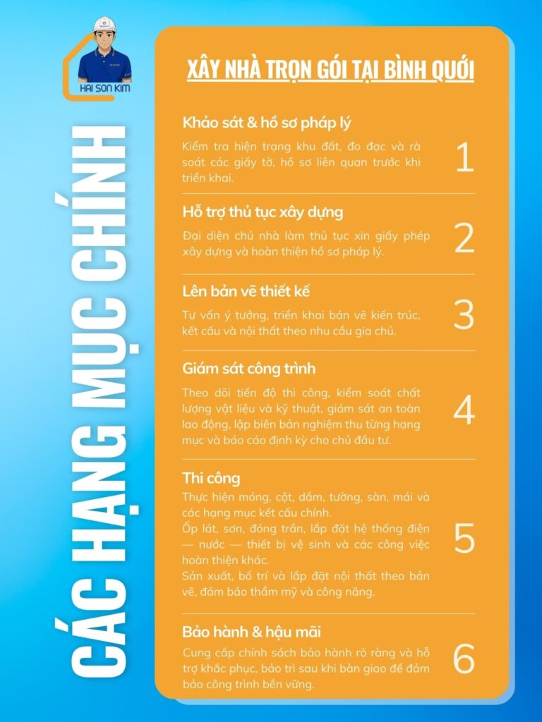 Các hạng mục công việc chính của xây nhà trọn gói tại Bình Quới bao gồm: