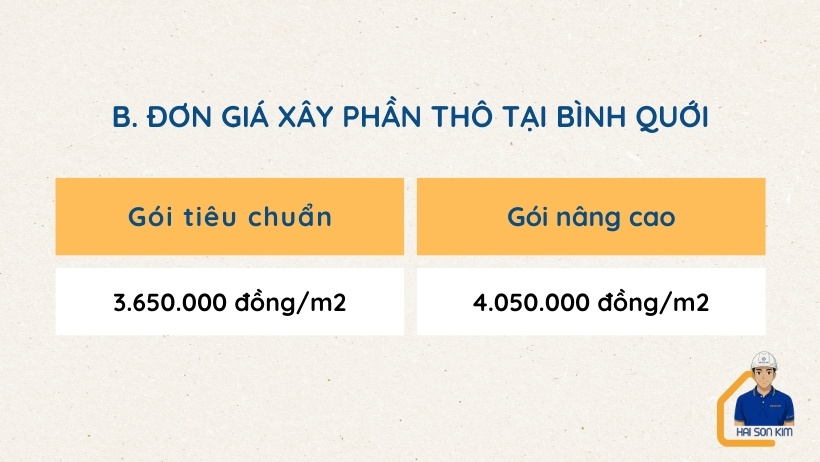 - Đơn giá xây dựng phần thô tại Bình Quới dao động từ 3.650.000 – 4.050.000 đ/m2.