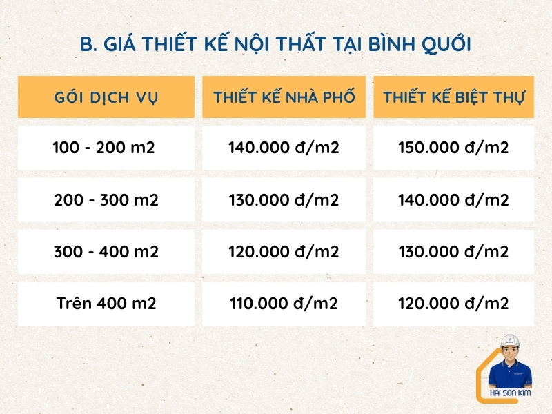 Dưới đây là đơn giá thiết kế tại Bình Quới, cụ thể như sau: