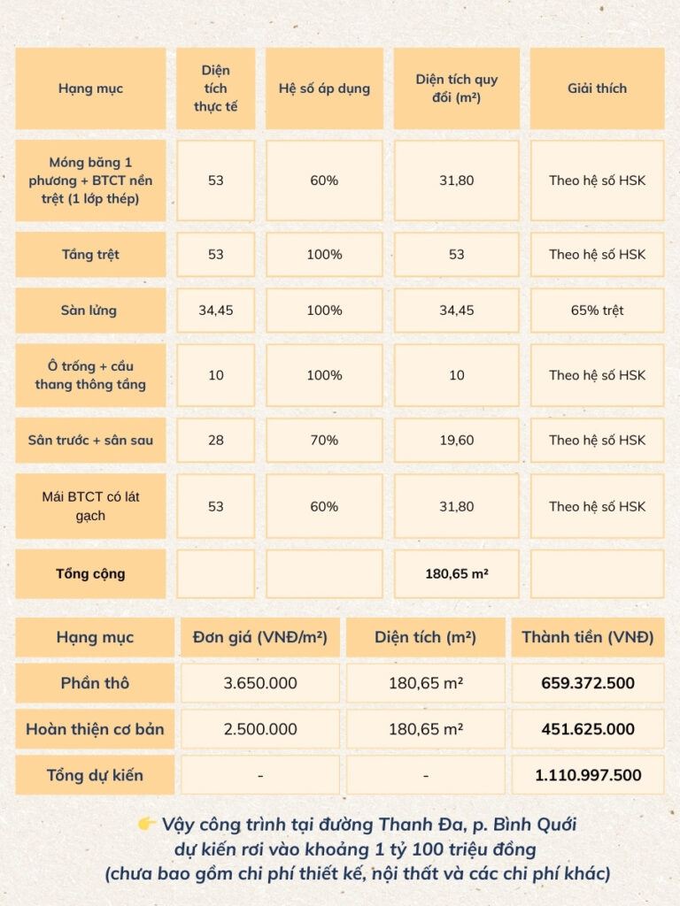 Cách tính đơn giá xây nhà trọn gói tại Bình Quới cụ thể như sau: