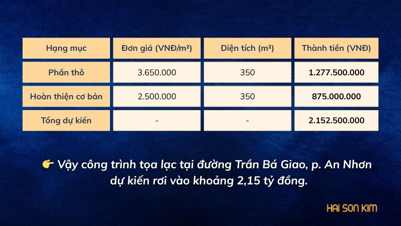Ví dụ về tính diện tích và giá trị ước tính công trình tại phường An Nhơn