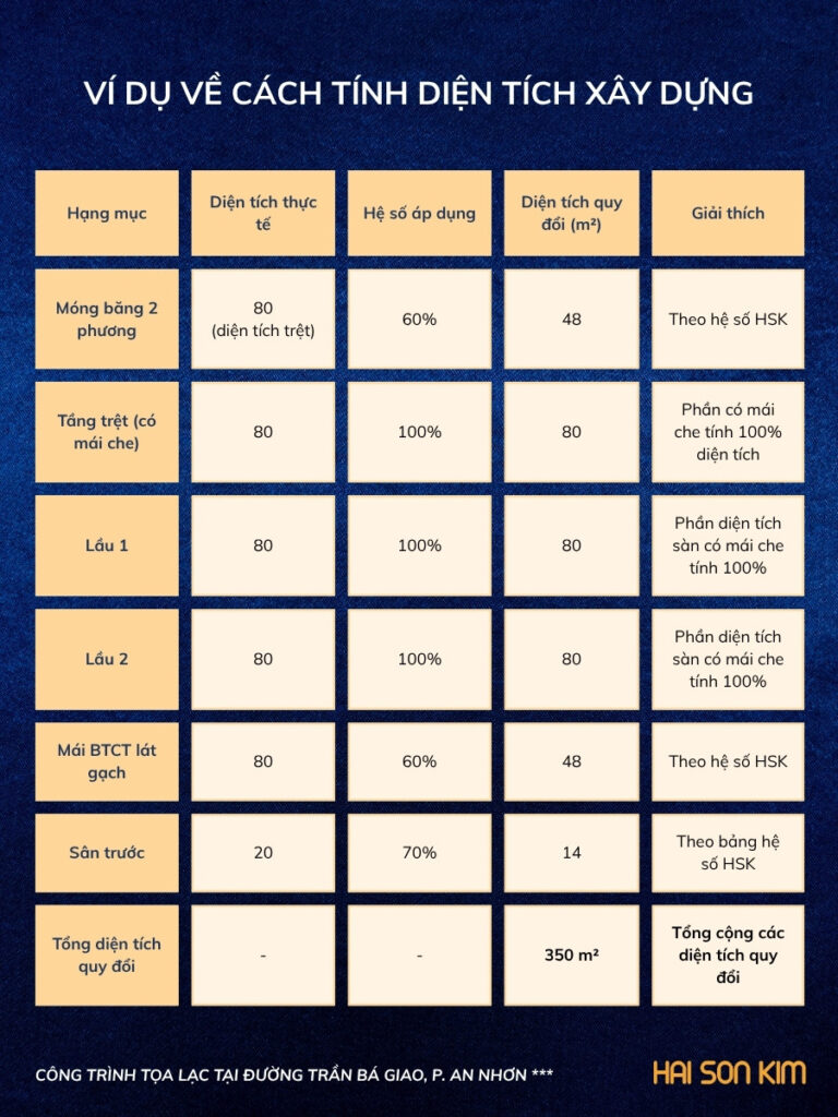 Dưới đây là ví dụ minh họa cách tính diện tích xây dựng và tính giá trị công trình: