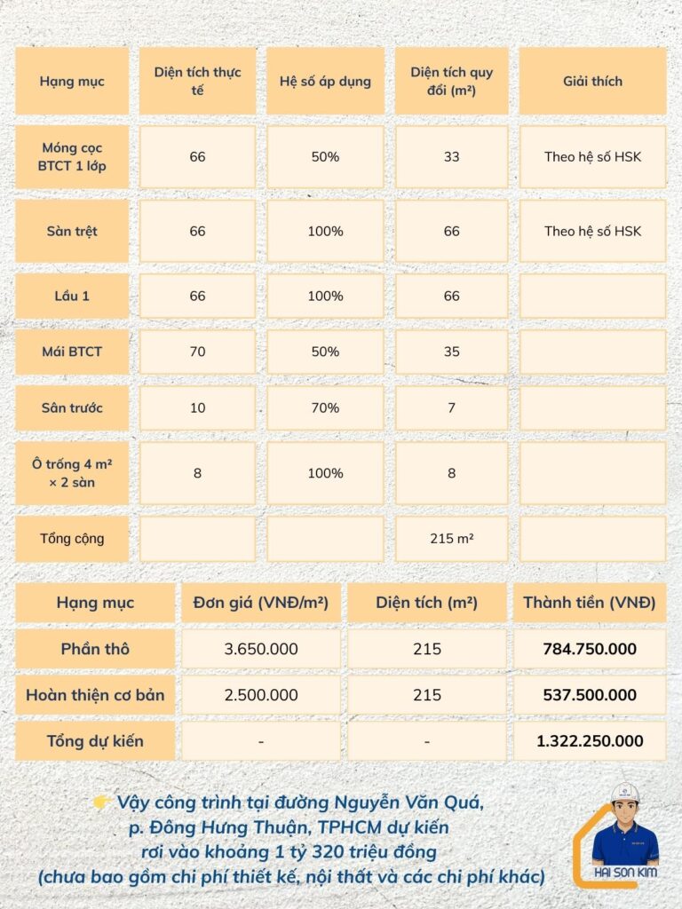 Ví dụ về tính diện tích và giá trị công trình giả định tại Đông Hưng Thuận