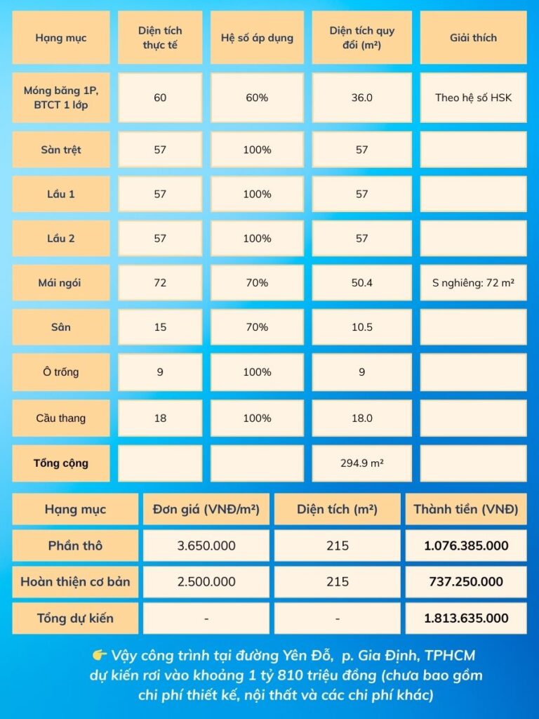 Dù vậy, tại Hải Sơn Kim cũng như nhà thầu xây dựng khác tại P. Gia Định đều sử dụng cách tính khái toán dựa trên đơn giá xây dựng. Phương pháp này giúp gia chủ tự ước lượng được tổng chi phí cần chuẩn bị mà không phải trải qua quá nhiều bước khảo sát hay yêu cầu báo giá chi tiết.