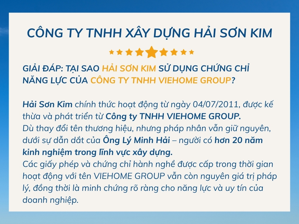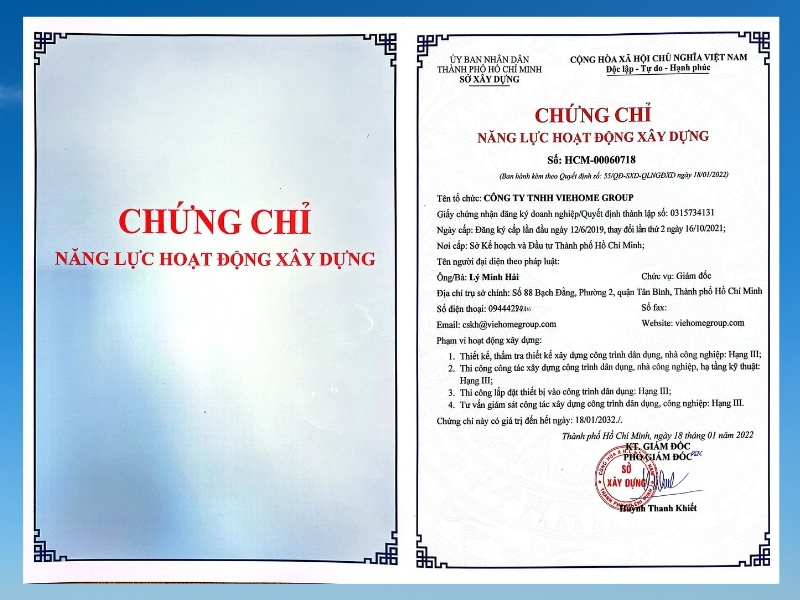 Công ty TNHH Xây Dựng Hải Sơn Kim là đơn vị uy tín chuyên cung cấp dịch vụ xây nhà trọn gói tại phường Thông Tây Hội. Chúng tôi đáp ứng đầy đủ các điều kiện pháp lý trong lĩnh vực xây dựng, bao gồm giấy phép kinh doanh và chứng chỉ năng lực hoạt động.