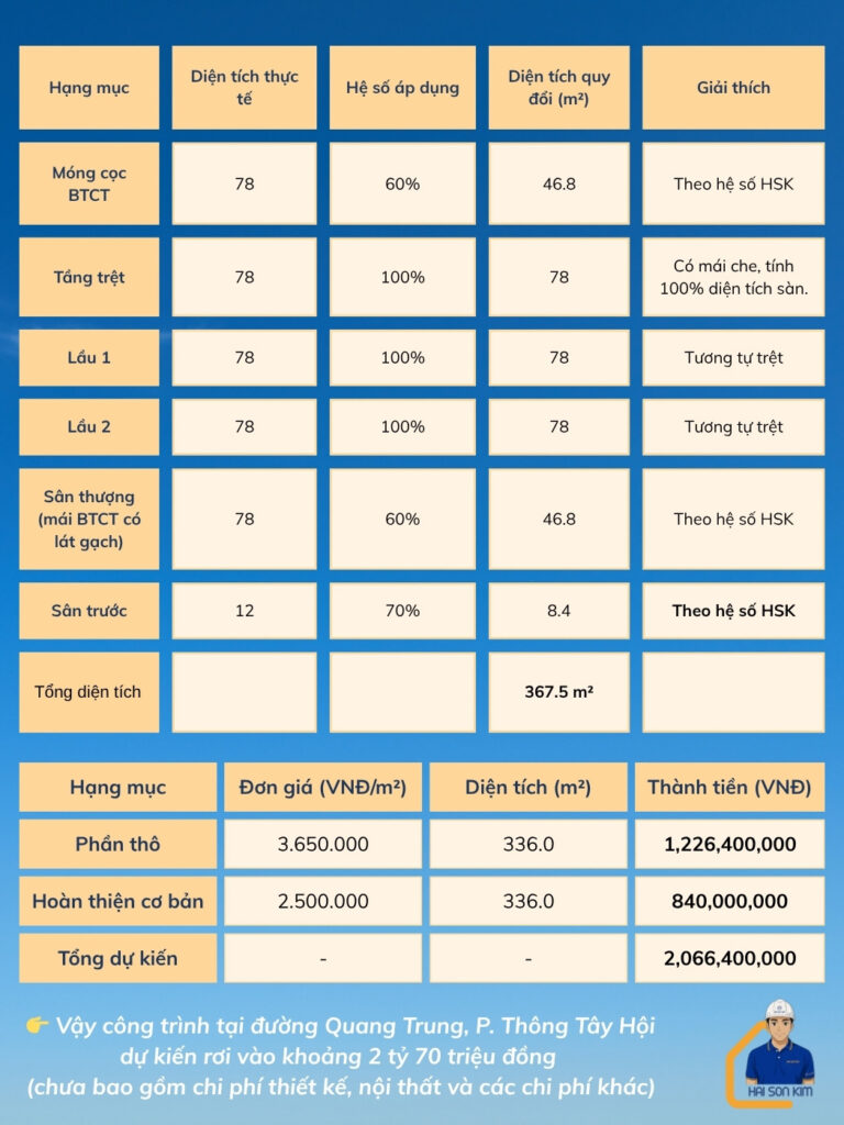Dưới đây là cách tính chi phí xây nhà trọn gói được áp dụng phổ biến tại khu vực Thông Tây Hội, giúp bạn dễ dàng dự trù ngân sách phù hợp cho công trình của mình.