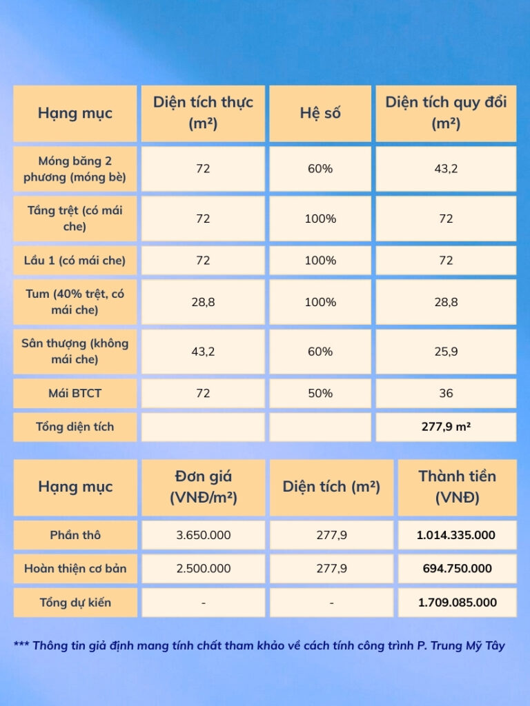 Vậy theo thông tin công trình giả định, chi phí xây nhà trọn gói tại phường Trung Mỹ Tây khoảng 1 tỷ 700 triệu đồng (chưa bao gồm các chi phí thiết kế, chi phí nội thất và các hạng mục phụ khác).