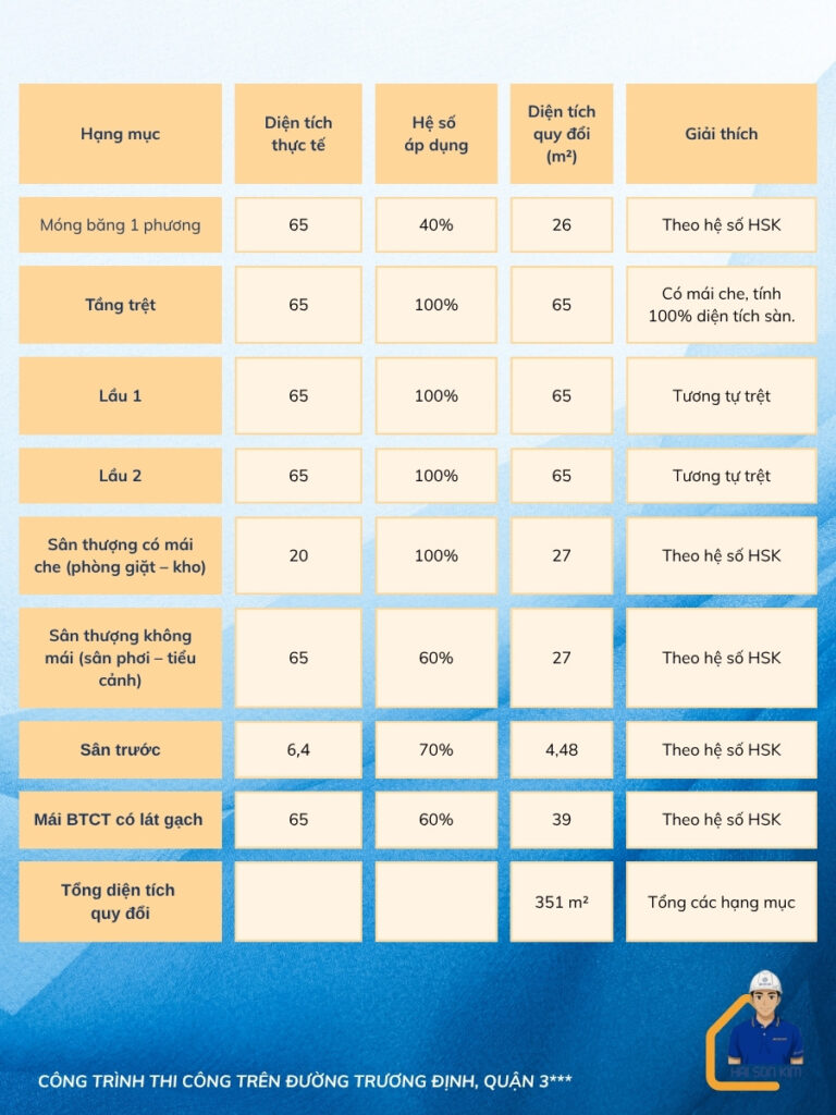 Bảng tính dựa trên cơ sở thông tin giả định và bảng hệ số của Hải Sơn Kim cung cấp: