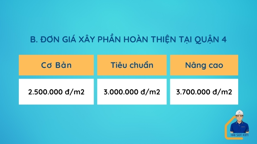 - Đơn giá xây dựng phần hoàn thiện Quận 4 từ 2.500.000 – 3.700.000 đ/m2