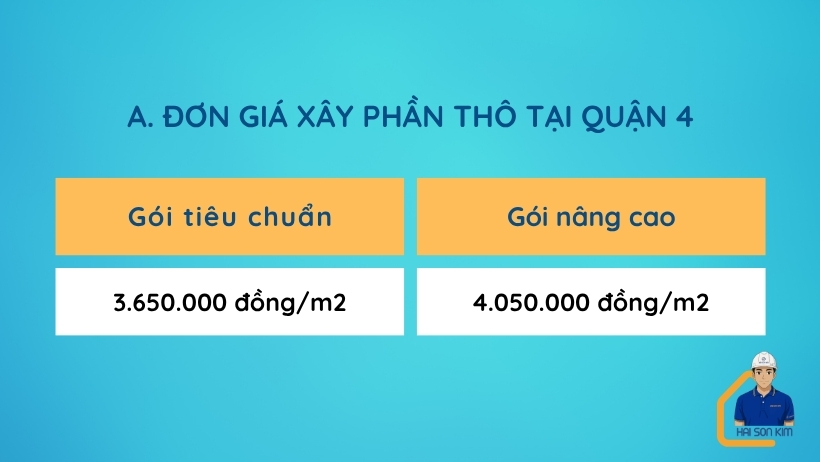 - Đơn giá xây dựng phần thô tại Quận 4 từ 3.650.000 – 4.050.000 đ/m2