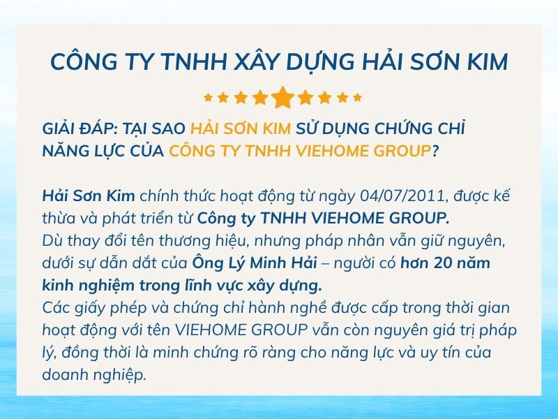 Hải Sơn Kim là công ty xây dựng Quận 5 uy tín, trong đó có lĩnh vực xây nhà trọn gói. Với hơn 14 năm hoạt động và đội ngũ kỹ sư giàu kinh nghiệm thực tế trên 20 năm, Hải Sơn Kim đã đồng hành trong nhiều dự án khác nhau, từ nhà phố, biệt thự đến các công trình lớn hơn như tòa nhà văn phòng, căn hộ dịch vụ, nhà máy,…