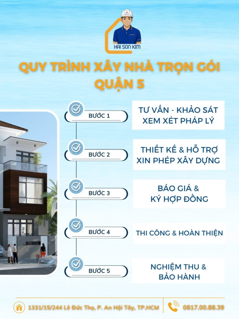 Hải Sơn Kim mong rằng sẽ trở thành một lựa chọn đáng cân nhắc khi bạn tìm kiếm đơn vị thi công phù hợp. Nếu bạn cần được tư vấn chi tiết về dịch vụ xây nhà trọn gói tại Quận 5, hãy liên hệ 0817008839 để được hỗ trợ và báo giá nhanh chóng.
