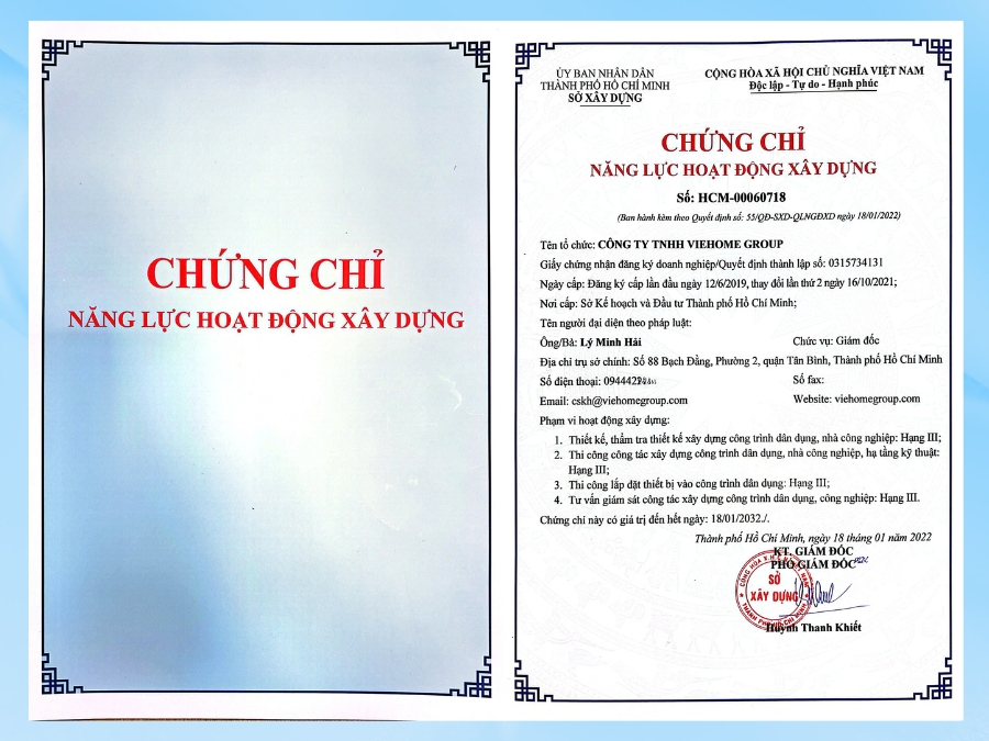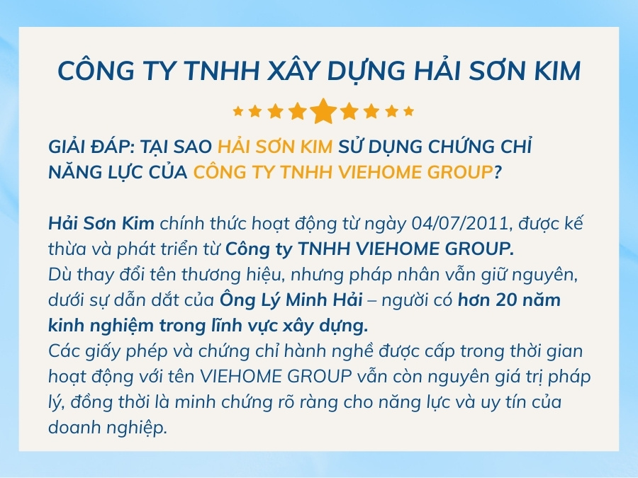 Hải Sơn Kim sở hữu giấy phép kinh doanh đúng ngành nghề xây dựng, cùng các chứng chỉ hành nghề theo quy định. Đây là cơ sở đảm bảo công trình được triển khai đúng pháp luật và tiêu chuẩn kỹ thuật.