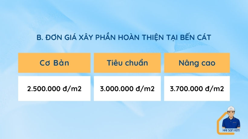 Đơn giá xây phần hoàn thiện tại Bến Cát