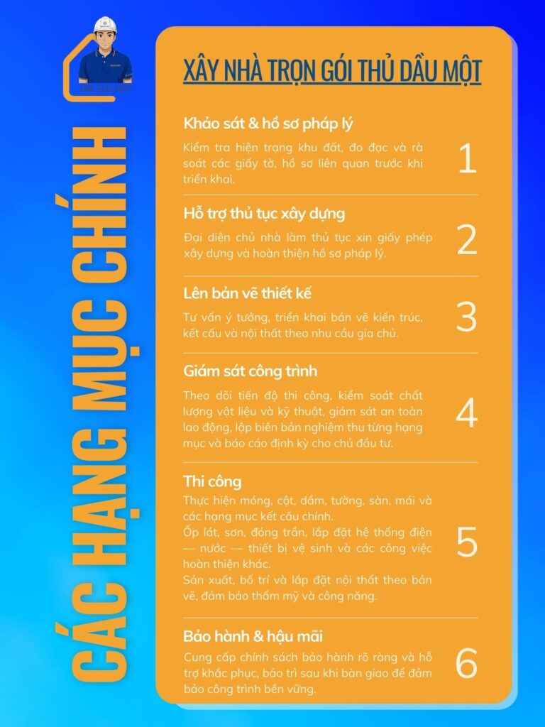 Các hạng mục công việc chính của dịch vụ xây nhà trọn gói tại Thủ Dầu Một cụ thể như sau: