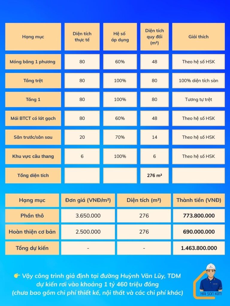 Ví dụ minh họa về cách tính diện tích và giá trị công trình tại Thủ Dầu Một